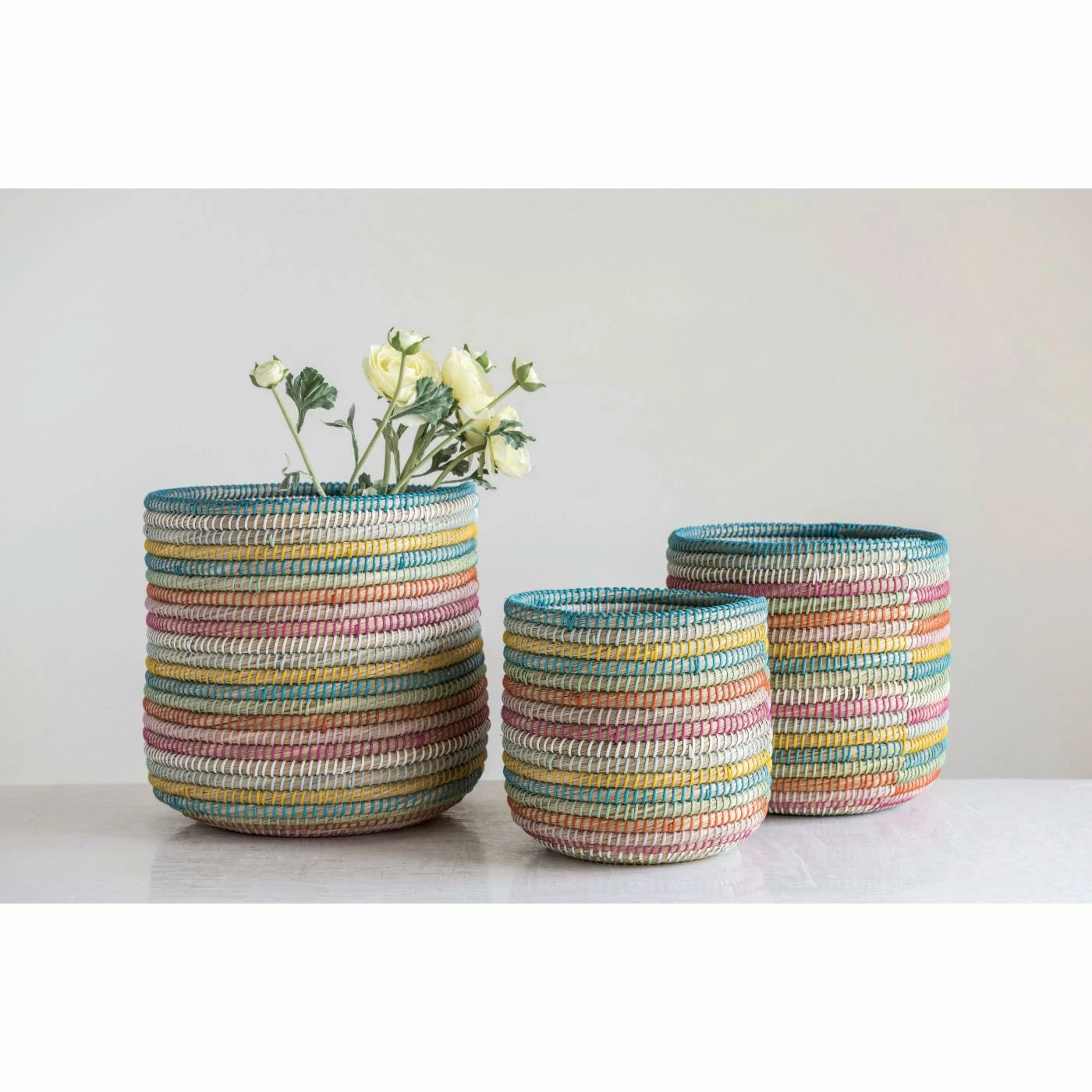 Set up a trio of potted plants or fill the 3R Studios Handwoven Multicolor Grass Baskets – Set of 3 with throw blankets and pillows for a pop of vibrant color in your global room. This set includes three handwoven grass baskets with a rainbow of colorful threads throughout. The round baskets are perfect for display or storage and can be place throughout your home or together as a cohesive accent.