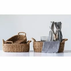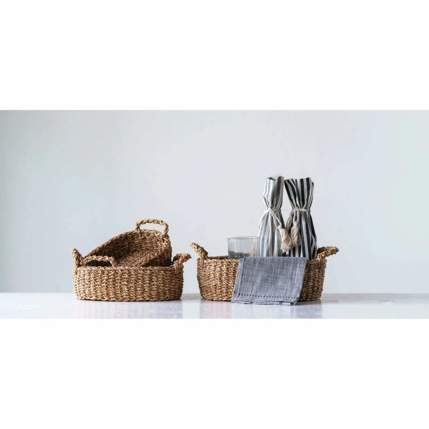 Add storage and style to your home with the 3R Studios Oval Natural Woven Seagrass Basket with Handles – Set of 3. Each basket is constructed of natural seagrass in a beige finish. These oval baskets have two handles, making it easy to transport them from room to room. Use the oval baskets as storage, or as decorative accents for practically any room in your home. Keep extra blankets, towels, or washcloths in the baskets, or use them to stage potted plants.