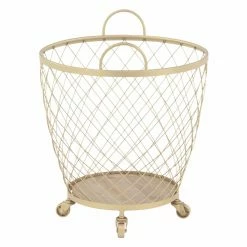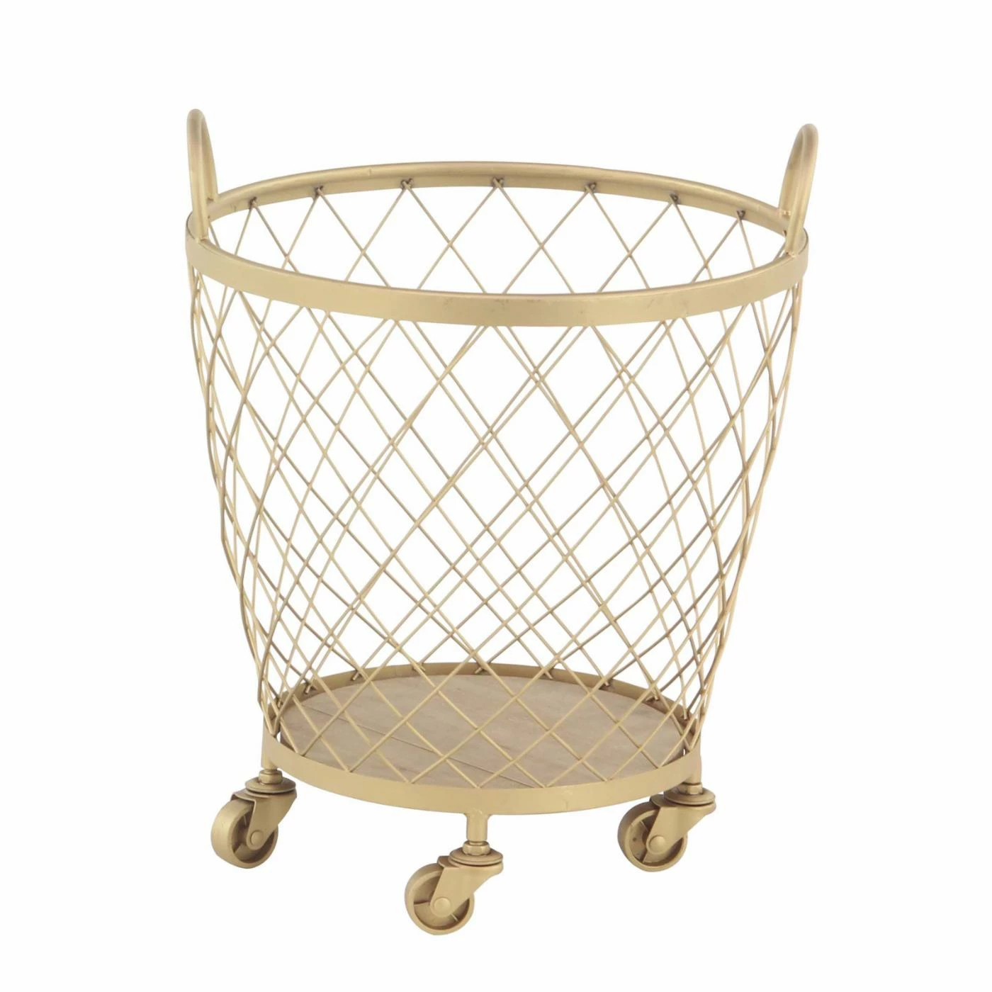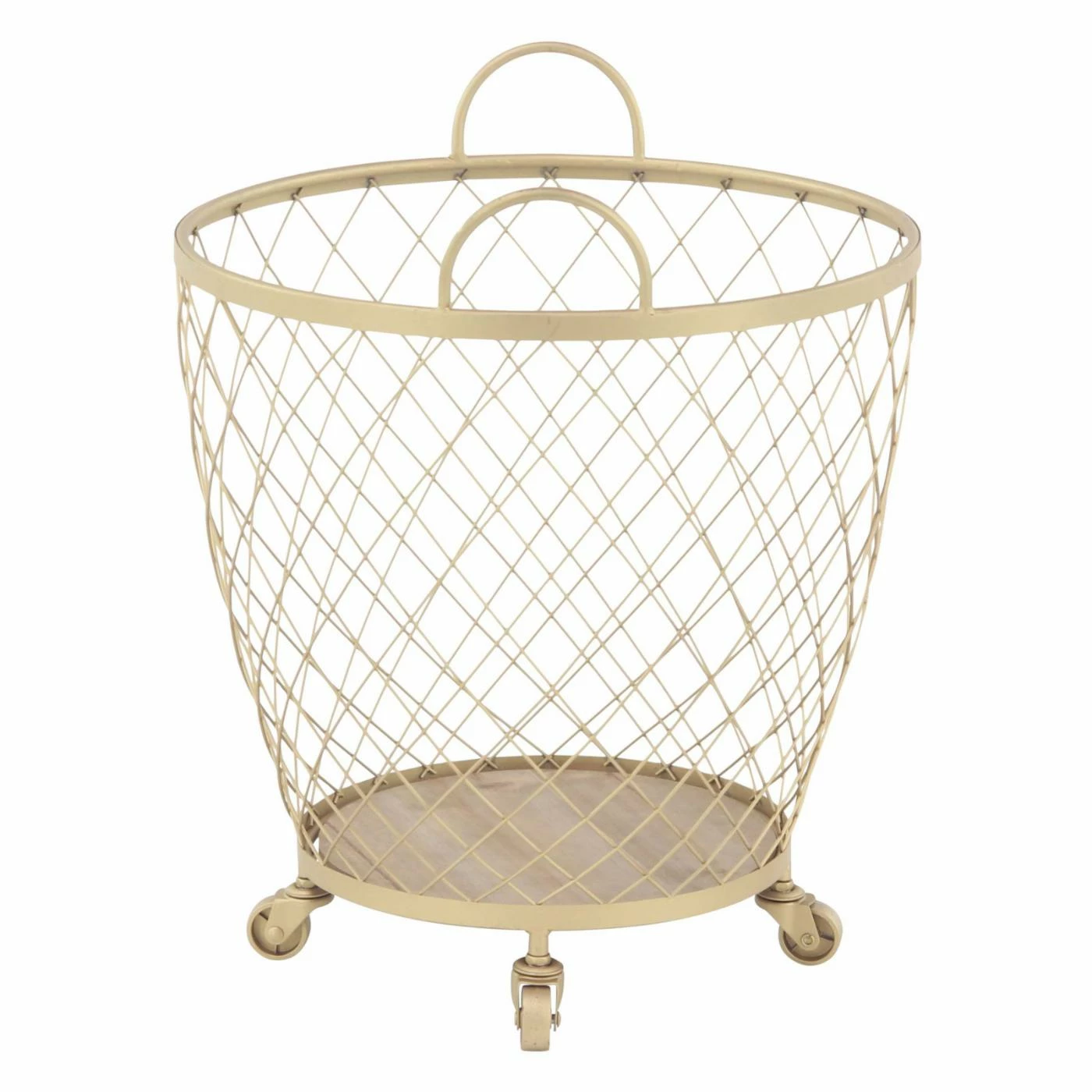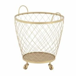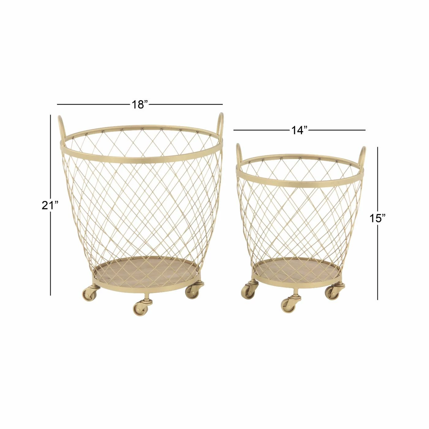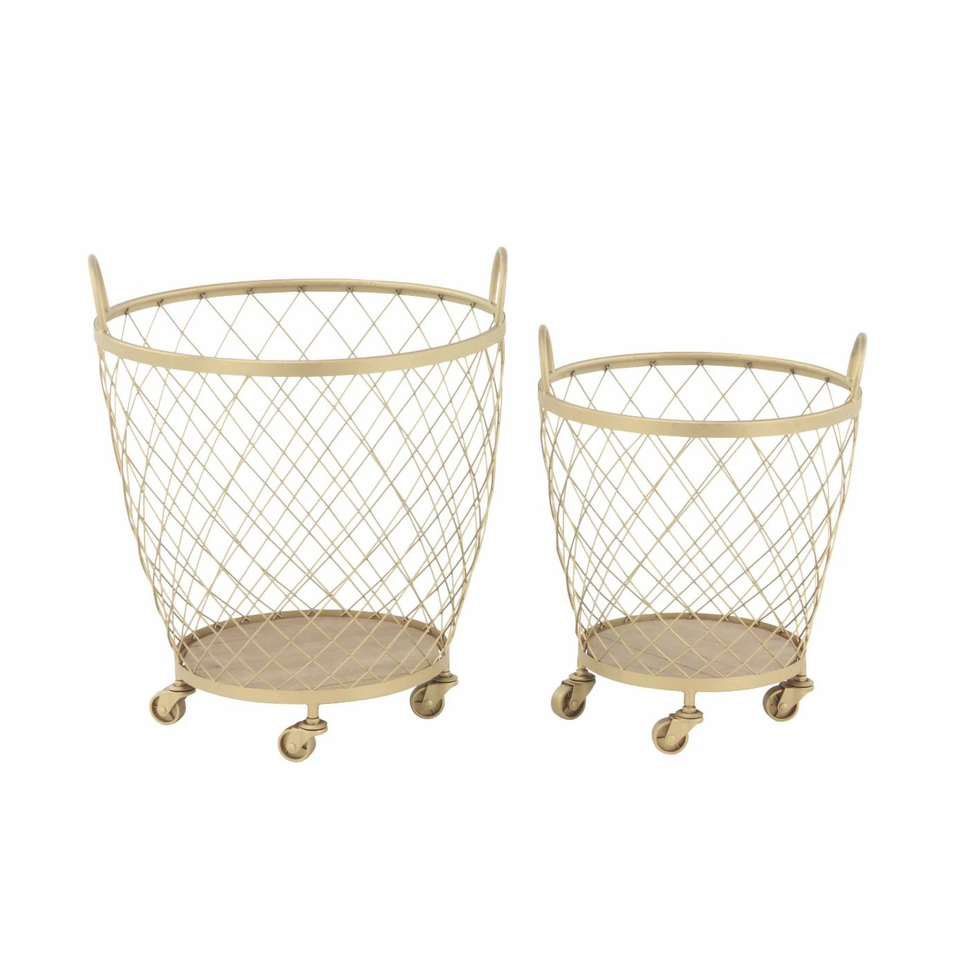 The DecMode Modern Diamond-Weave Round Iron Baskets with Wheels – Set of 2 are both stylish and functional. These baskets are crafted from iron and perched on wheels. Their bright gold finish will add an eye-catching touch to any area of your home.