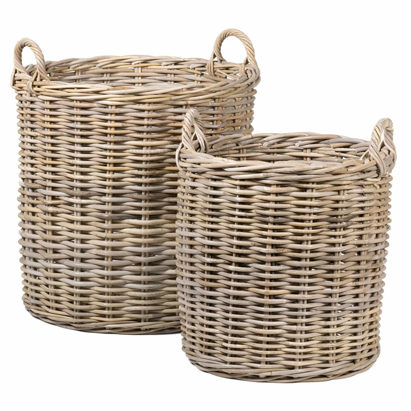 Handwoven from natural rattan, the East at Main Banda Round Rattan Basket with Handles – Set of 2 adds a warm accent to any space. These baskets are each equipped with a set of handles for easy carrying. For storage, the small basket will nest inside the larger one.