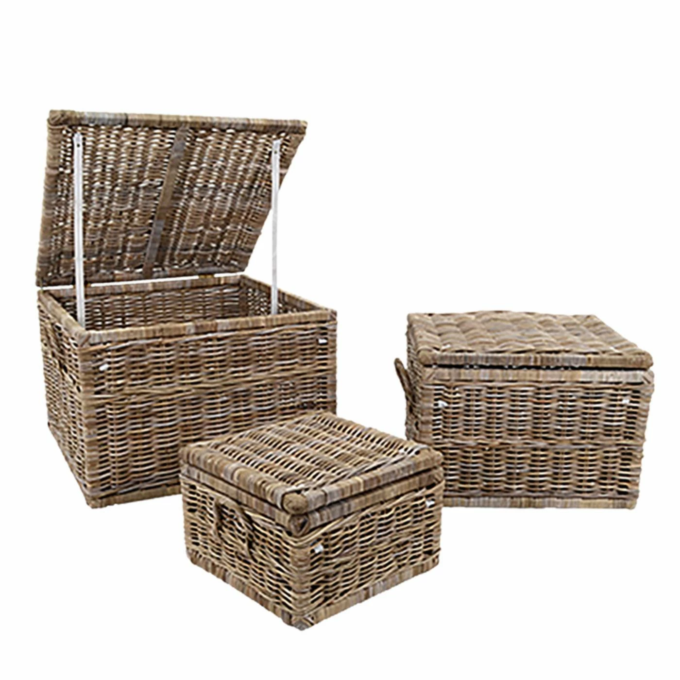 Store things in whimsically rustic style in the East At Main Catrina Storage Basket – Set of 3. These baskets feature a classic woven rattan look. Side handles make them easy to carry. Metal props keep the lids secure when open.