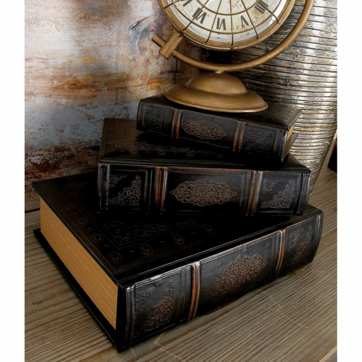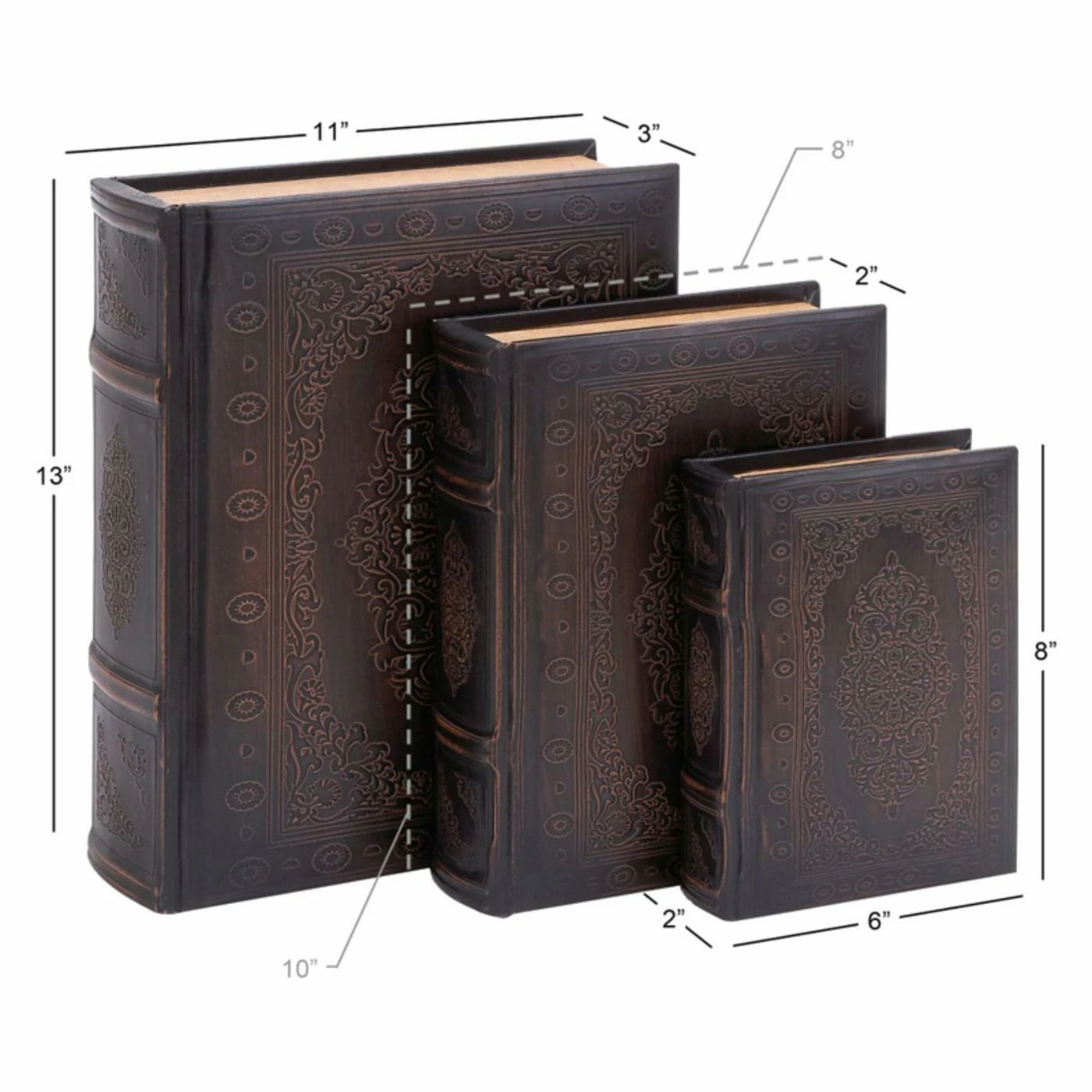 Joining worn and distressed-finish walnut brown and maroon synthetic leather covers and hollow interiors, the DecMode Wood and Leather Decorative Book Box – Set of 3 gives vintage charm to any room. With embossed scrollwork and flourished border, these synthetic leather book boxes have hollow interiors for storage.