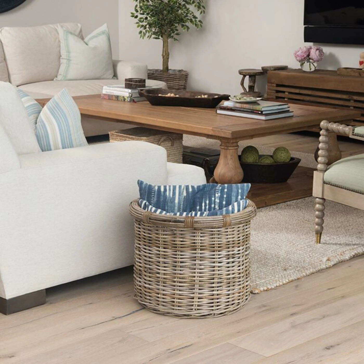 A cylindrical shape makes the KOUBOO Kobo Rattan Log Round Storage Basket an easy choice for keeping kindling by your fireplace or for use as a cachepot for your favorite house plant. The handwoven wicker basket comes in a natural warm gray tone that complements any interior design.