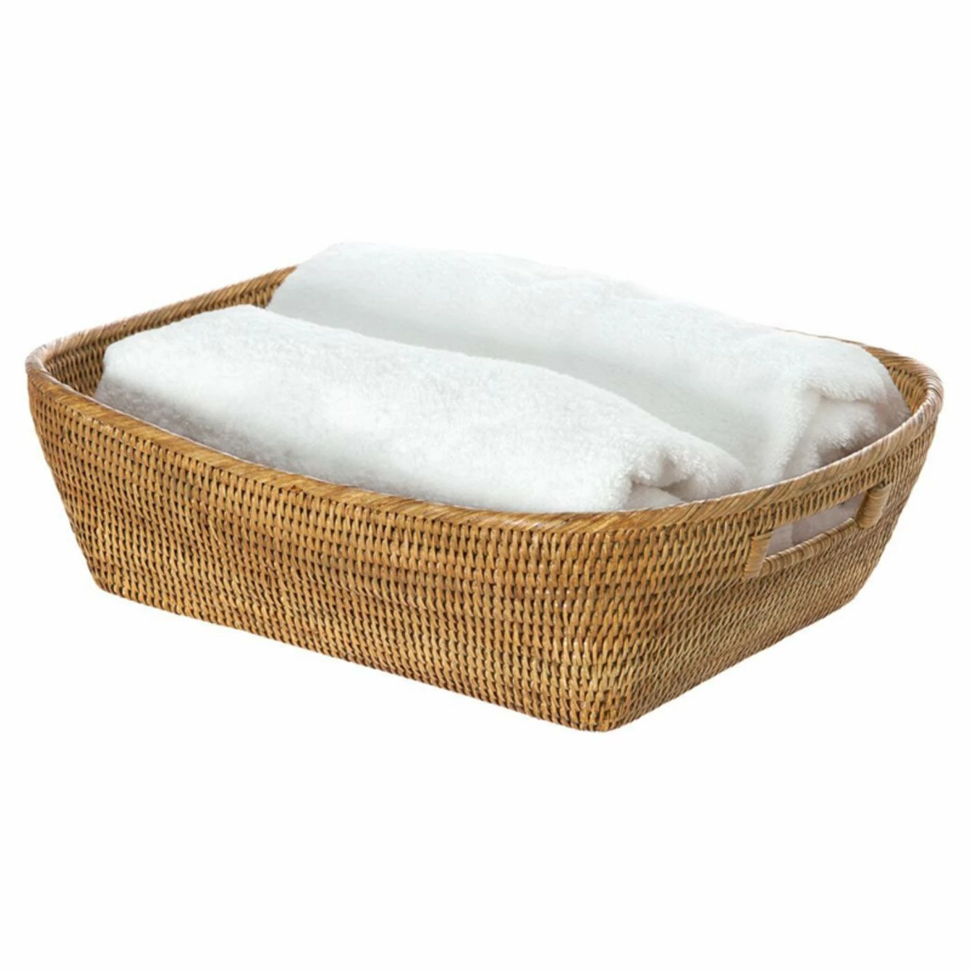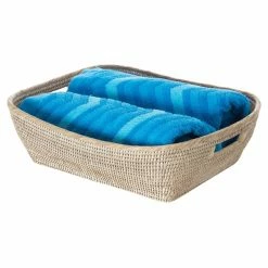 A tight weave and cut-out handles give the KOUBOO La Jolla Handwoven Oblong Rattan Shelf Storage Basket an elegant and practical design. This handwoven rattan basket is just the right size to use on any shelf, like the entryway console table, bathroom countertop, or linen closet. Choose from available color options.