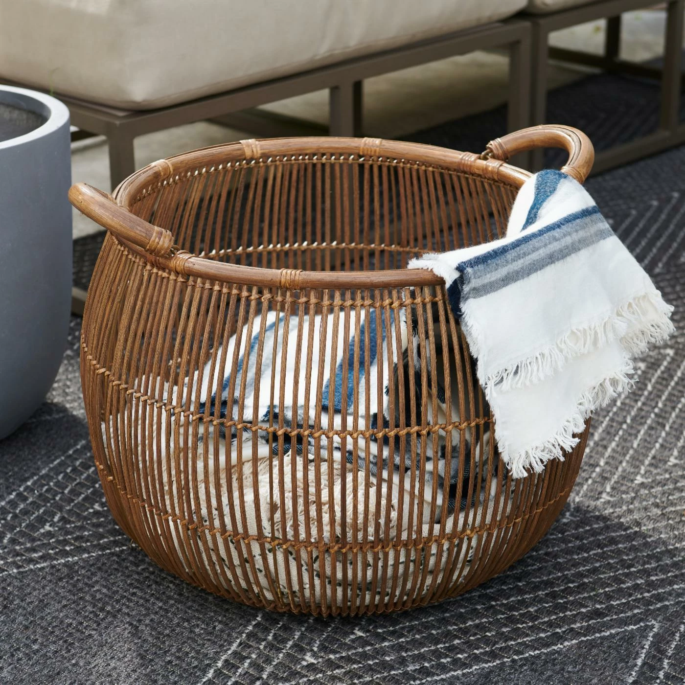 A spacious rattan weave means whatever you store inside the KOUBOO Large Open Weave Rattan and Wicker Storage Basket will become part of its style. This natural brown rattan and wicker basket has folding handles that make it ideal beside your sofa, in the bath, or as a chic planter.