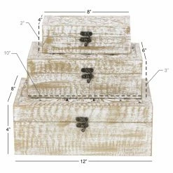 Weathered white finishing lends an antique look to the DecMode 3 Piece Carved Wooden Filigree Decorative Box Set. The mango wood, rosewood, and engineered wood design is gracefully carved for an elegant effect. Metal clasps keep these decorative boxes secure.