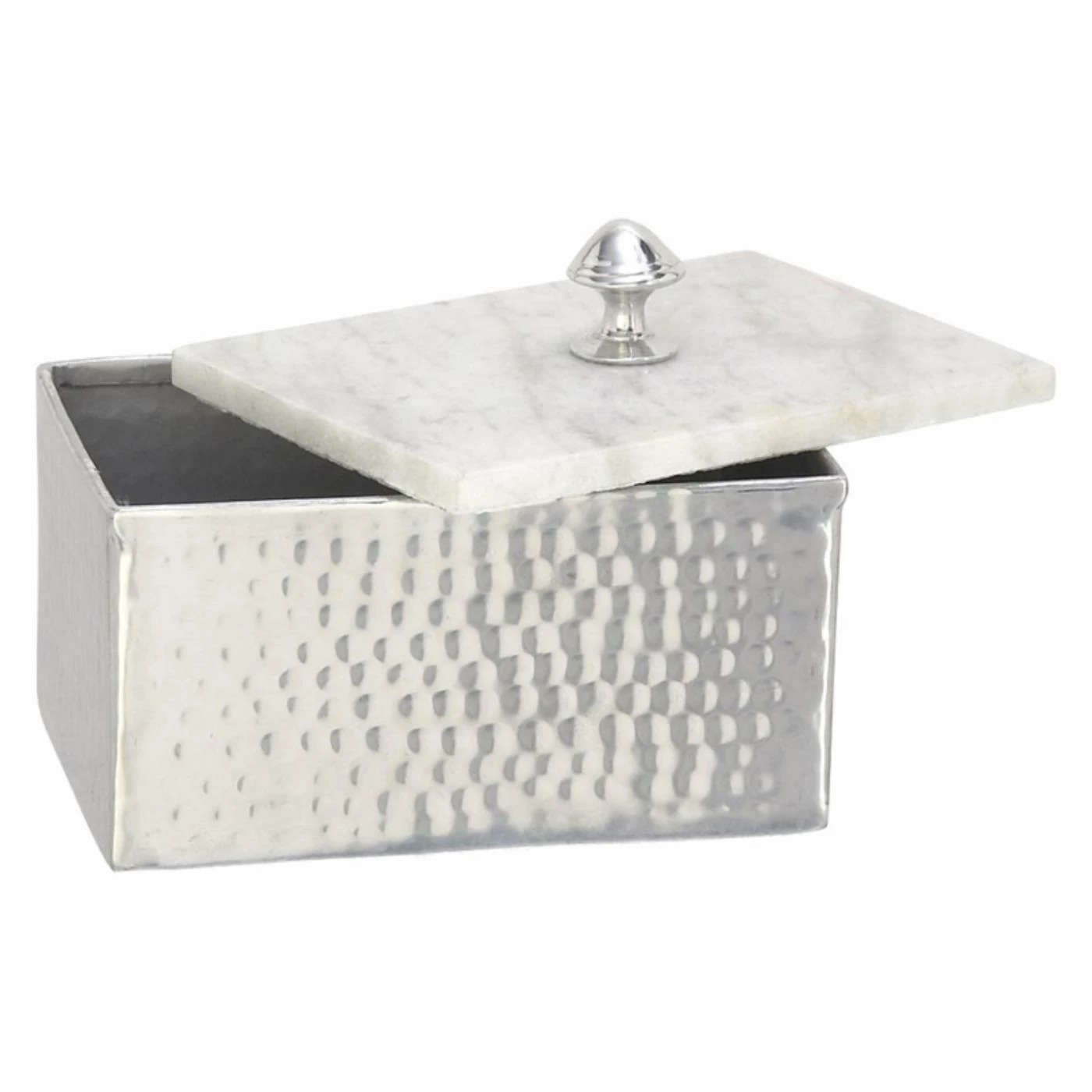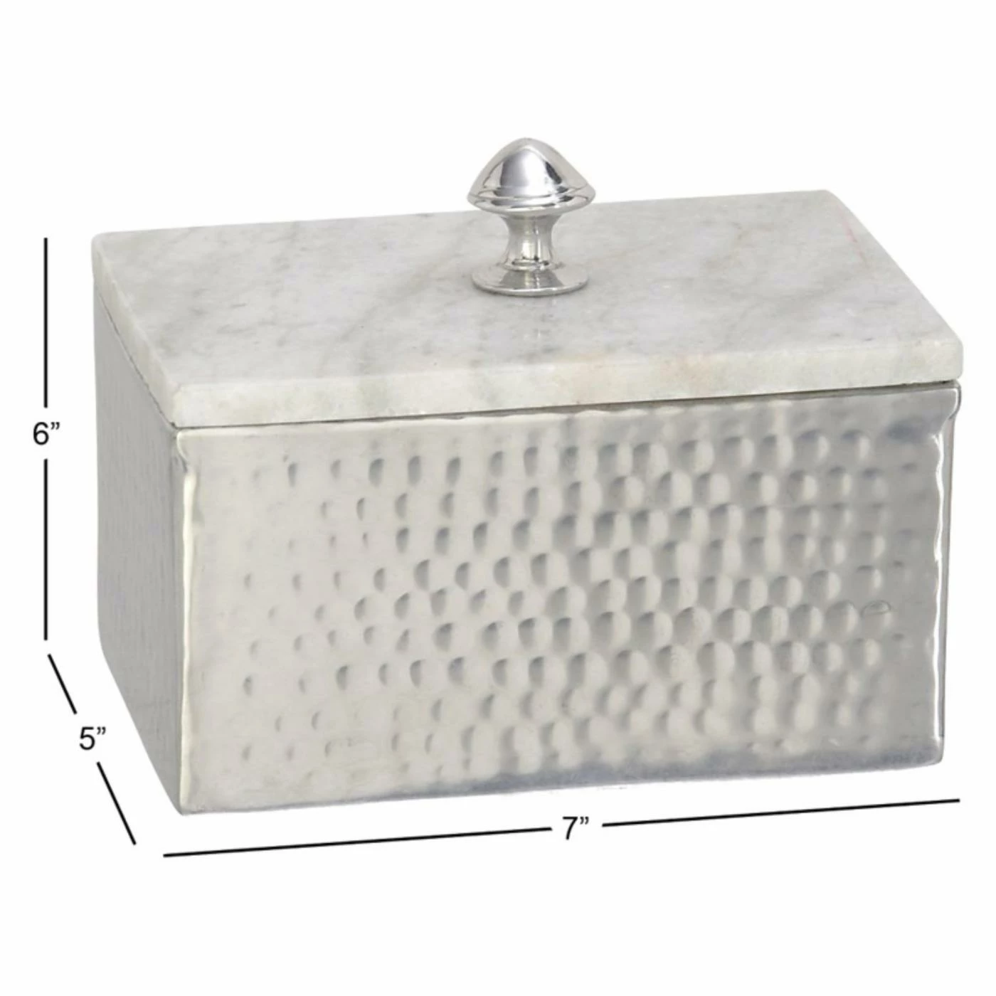 Pairing an elegant white marble stoneware lid with a shimmering silver aluminum body, the DecMode Aluminum Rectangle Decorative Box adds a sleek, modern touch to tabletops and shelves. The rectangular box has been hammered, creating dimples in the metal that enhance its reflectivity. A tapered finial on the top of the lift-off lid adds style and makes the box easy to open. Because aluminum is impervious to tarnishing, you can count on the box to remain lustrous without any need for polishing.