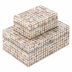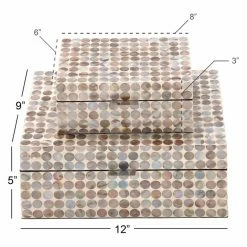 Featuring wood-style MDF construction, the DecMode Mop Inlay Decorative Box – Set of 2is colored with a classic tan finish. Covered in an all over dot design, this set includes soft complementary shades to complement home or office.