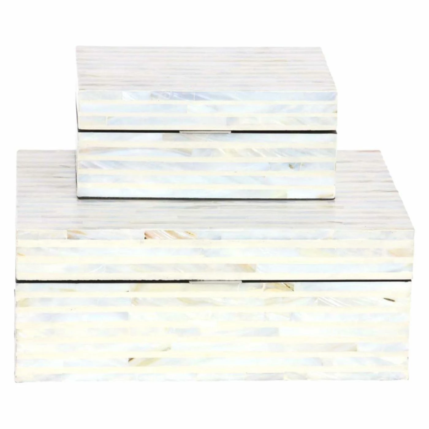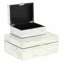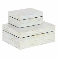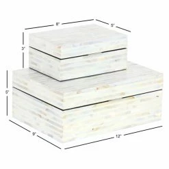 Stripes of genuine mother of pearl glisten in the design of the DecMode Mother of Pearl Decorative Box- Set of 2. An elegant addition to bedroom or living room dΓ©cor, the pair of boxes is fashioned out of lightweight, durable engineered wood. The hinged lids feature simple silver metal handles for easy opening and closing. Stack the boxes up or use them in two different spots in your room for storage or as decorative accents.