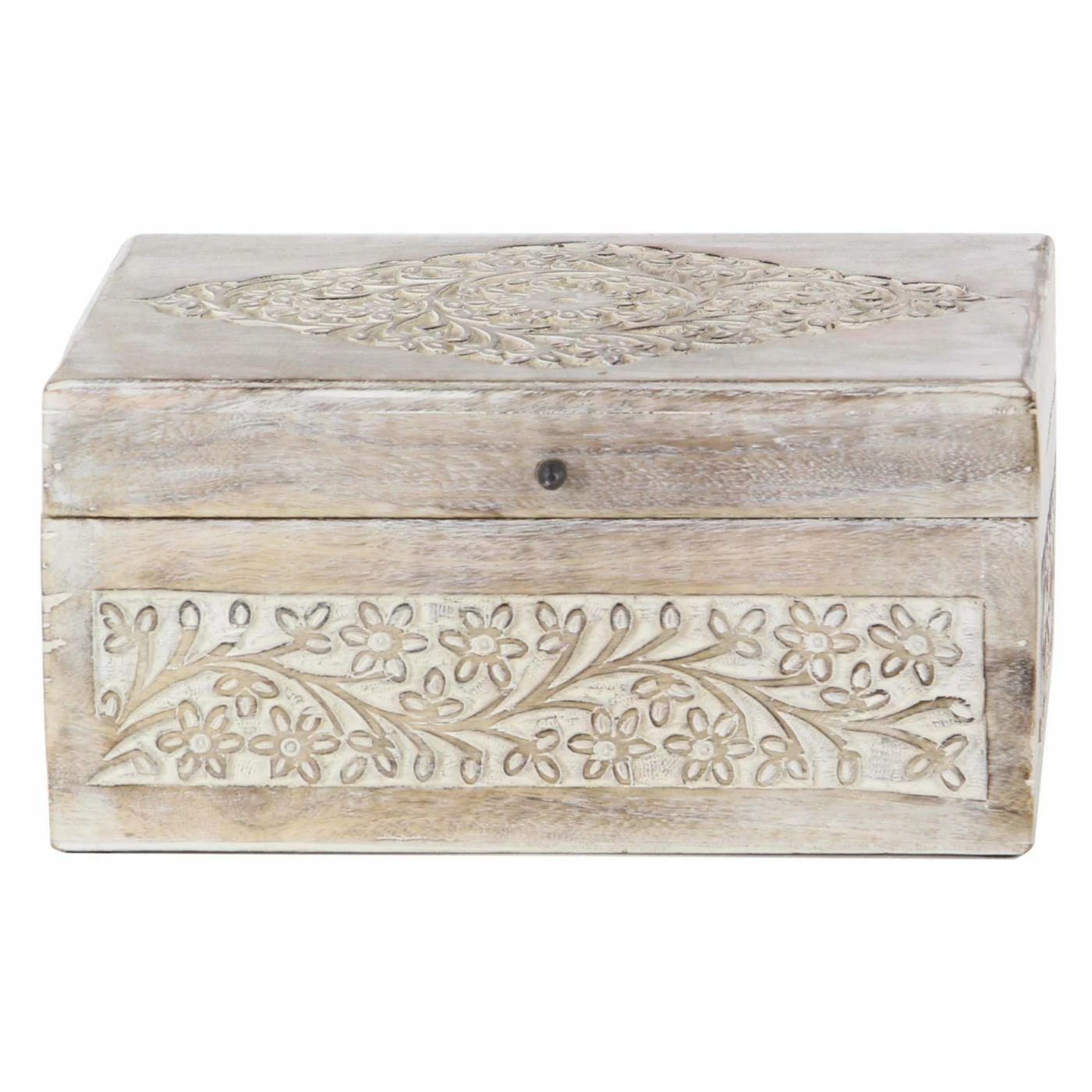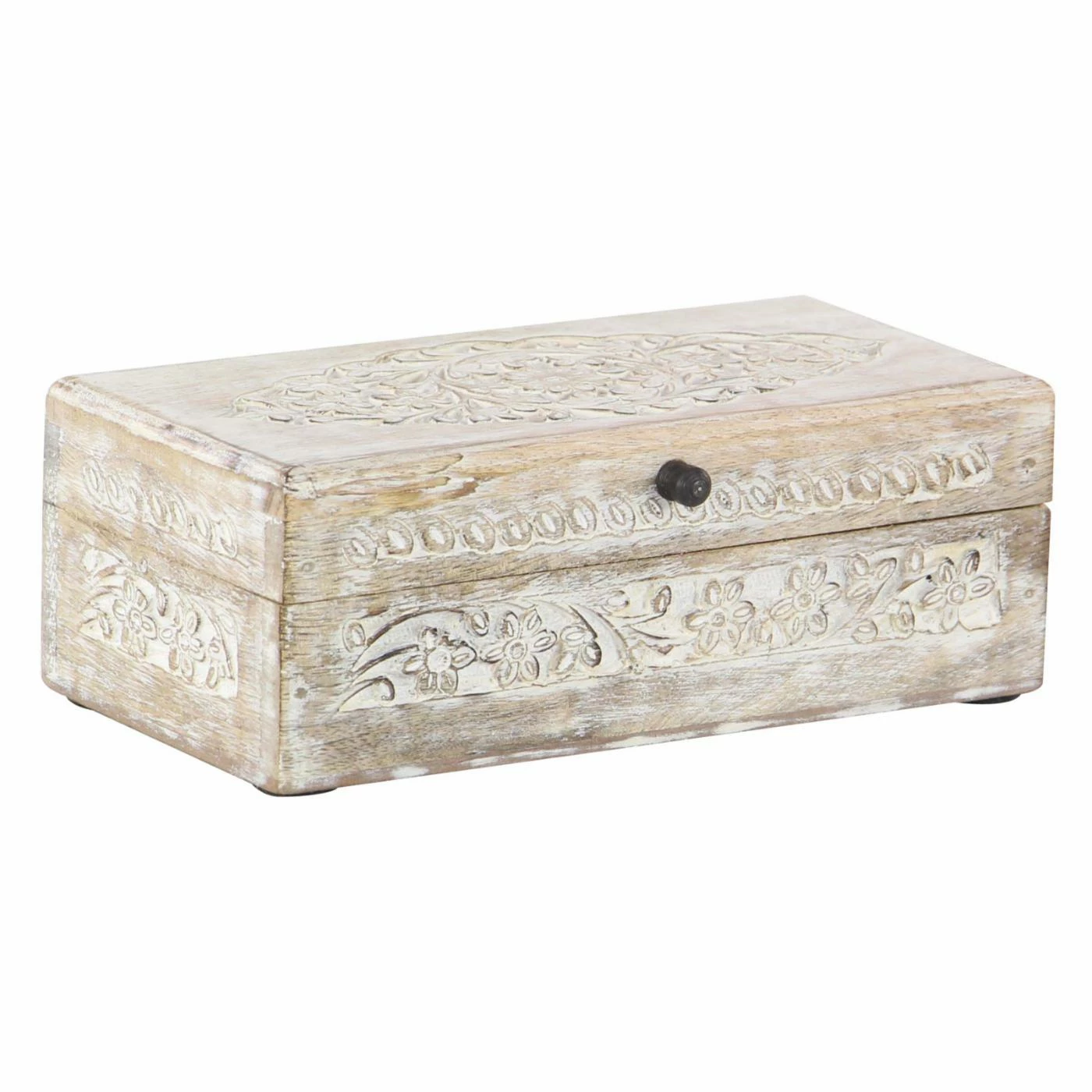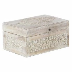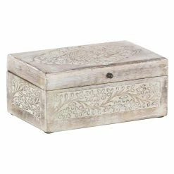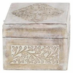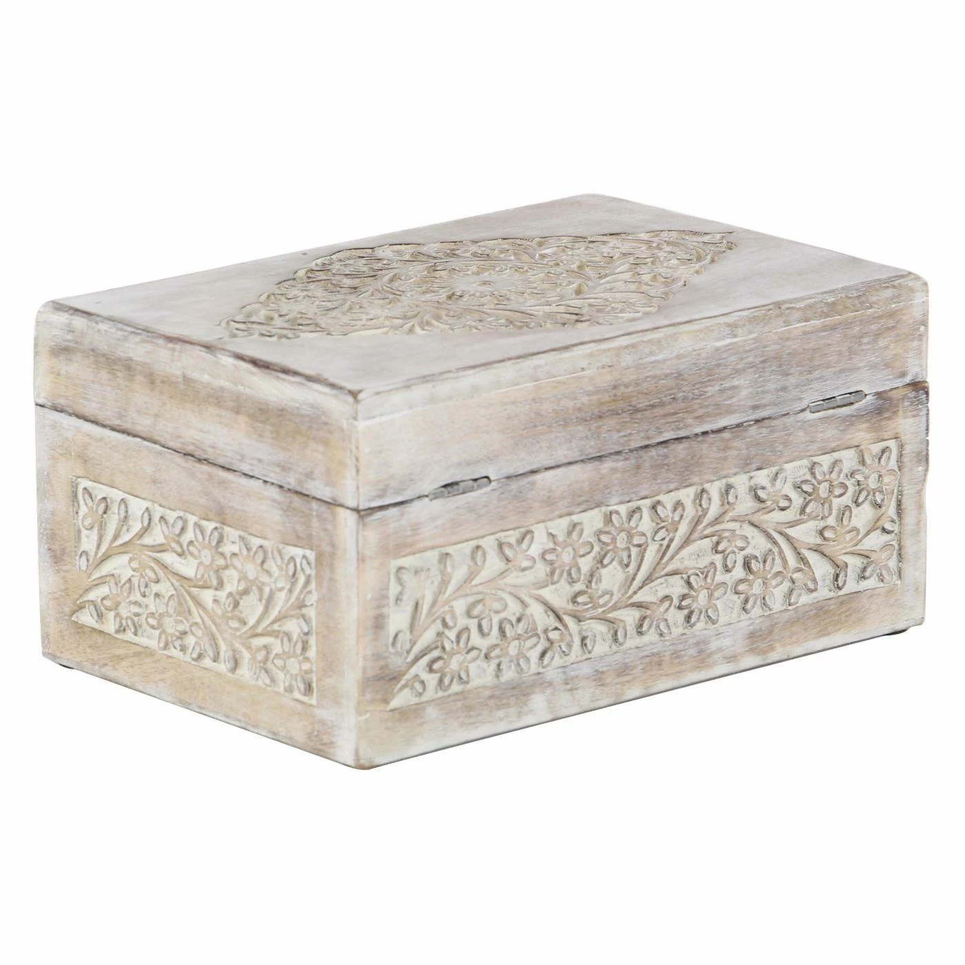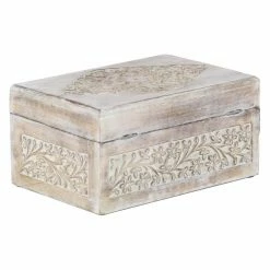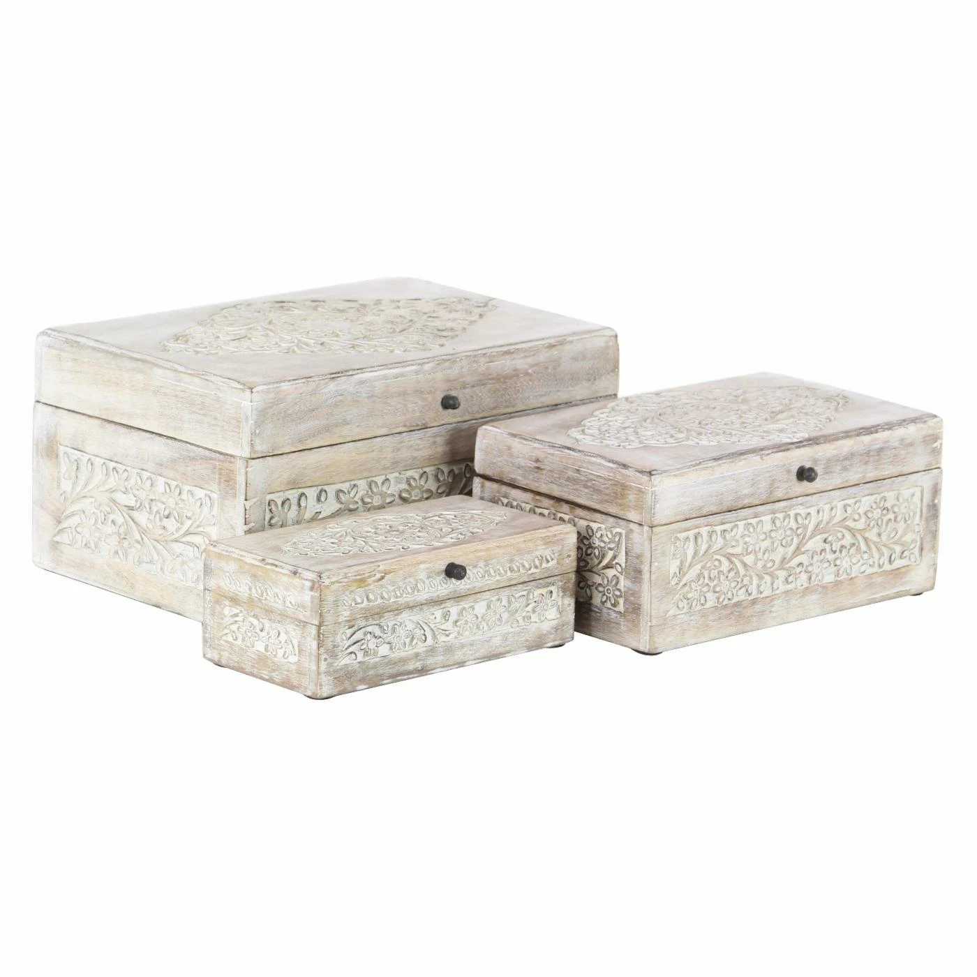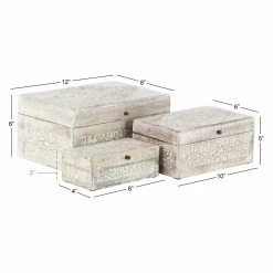 Enhance your setting with the DecMode Natural Mango Wood Whitewashed Carved Design Boxes with Lid – Set of 3. These boxes feature distinctive carving and a versatile beige finish. Their distressed design enhances their vintage-inspired charm.