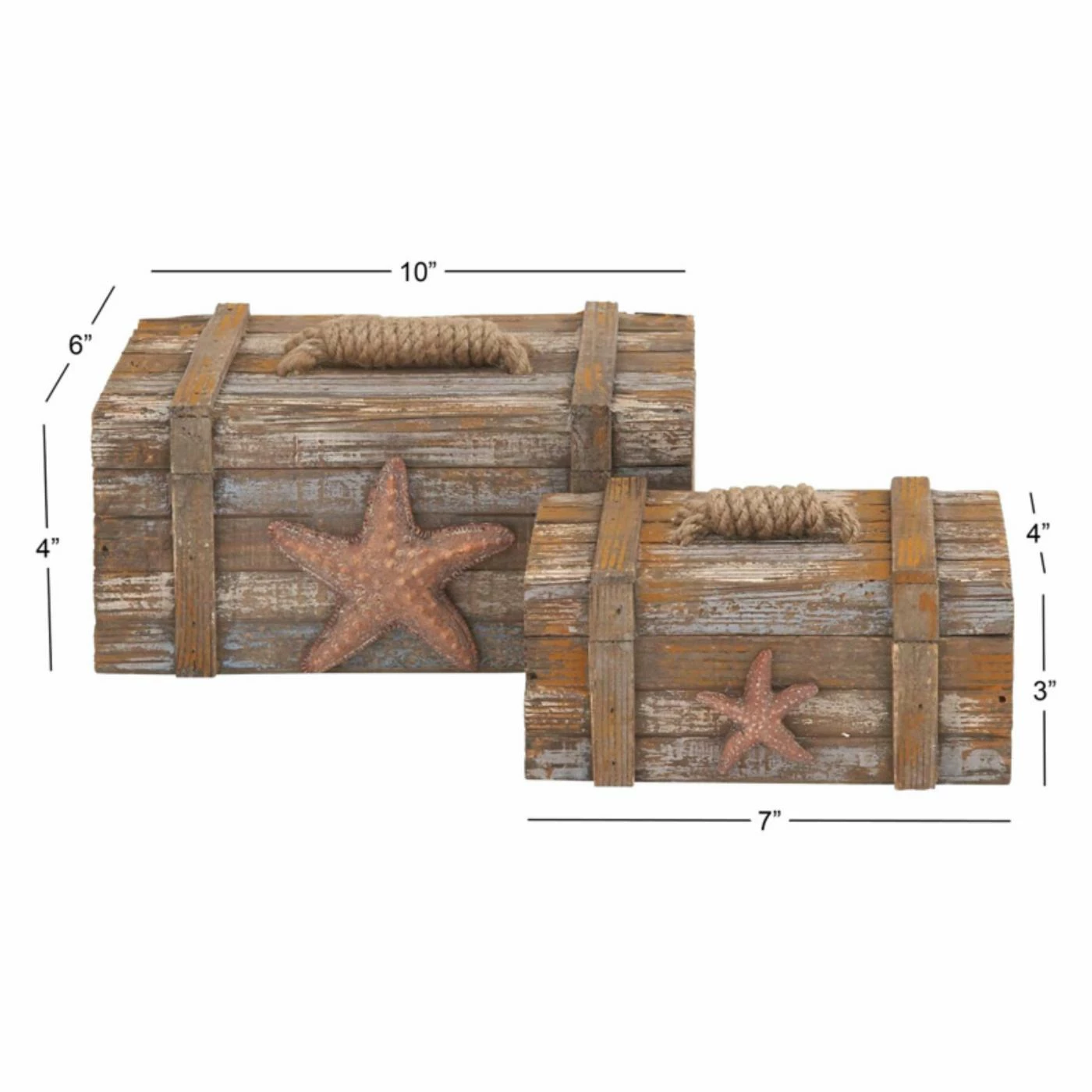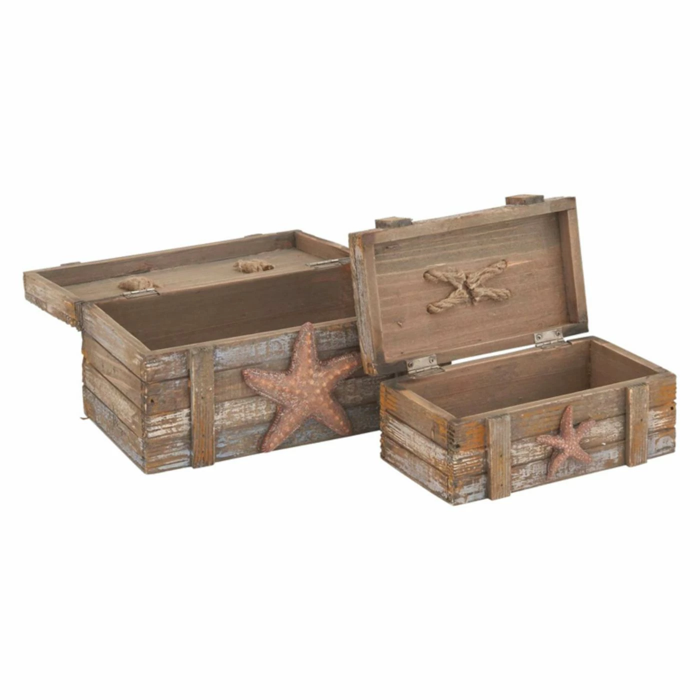 Complete your coastal dΓ©cor with the DecMode Starfish Wood Decorative Box – Set of 2. This pair of rectangular storage boxes is crafted out of planks of Chinese fir wood in a cornflower blue, vintage white, and natural finish. With their distressed detailing, the boxes look as if they were fabricated out of driftwood. Each box features a three-dimensional starfish on its front and a rustic, jute rope handle on its hinged lid.