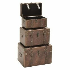 Fill the DecMode Wood and Leather Decorative Box – Set of 3 with keepsakes, throws, and pillows or clothing, and stack them up to add a vintage touch to your interior. The engineered wood boxes reflect the style of antique travel cases with their faux leather trim and riveted metal accents. Finished in rich mahogany accented by brass, the boxes feature hinged lids secured by buckling straps and metal clasps.