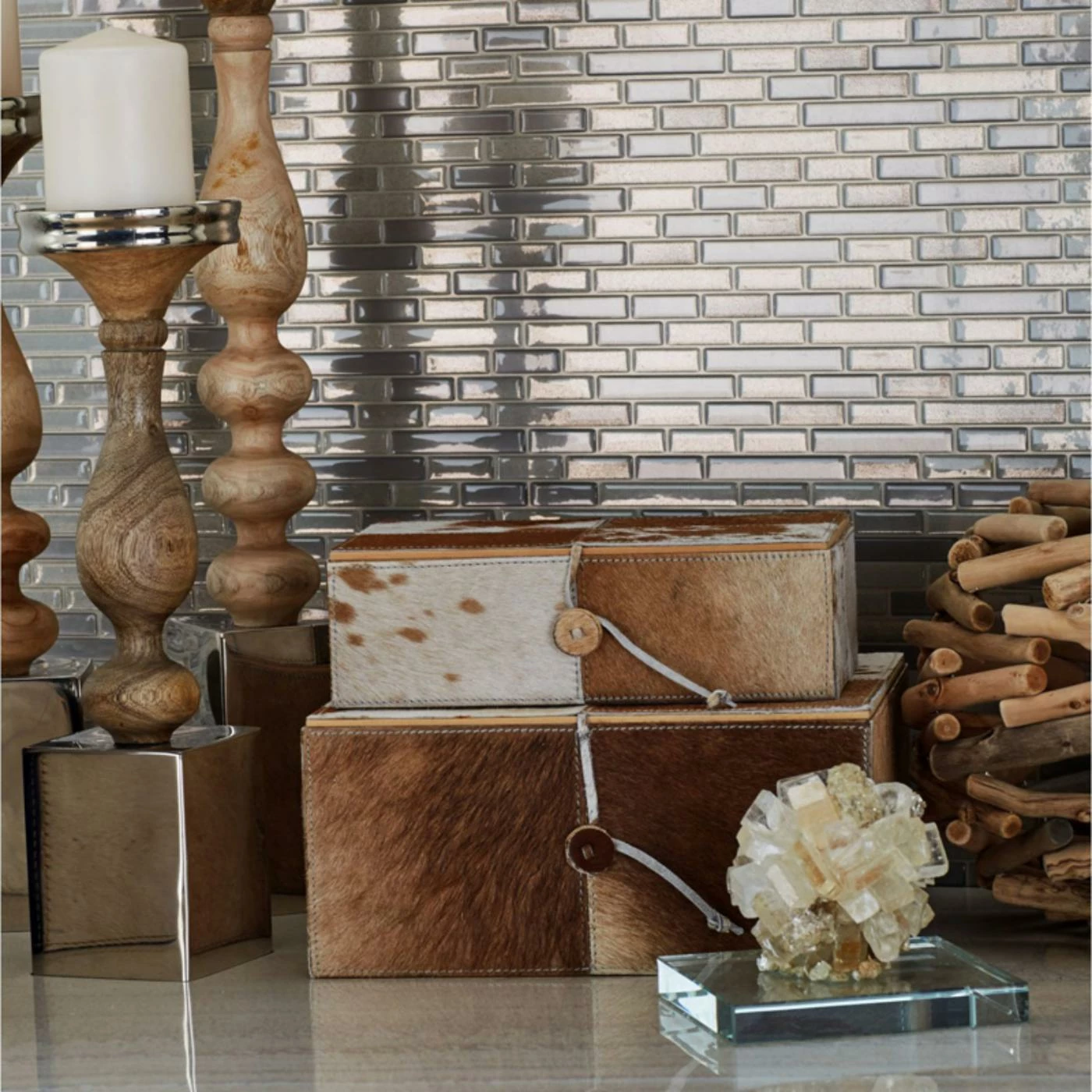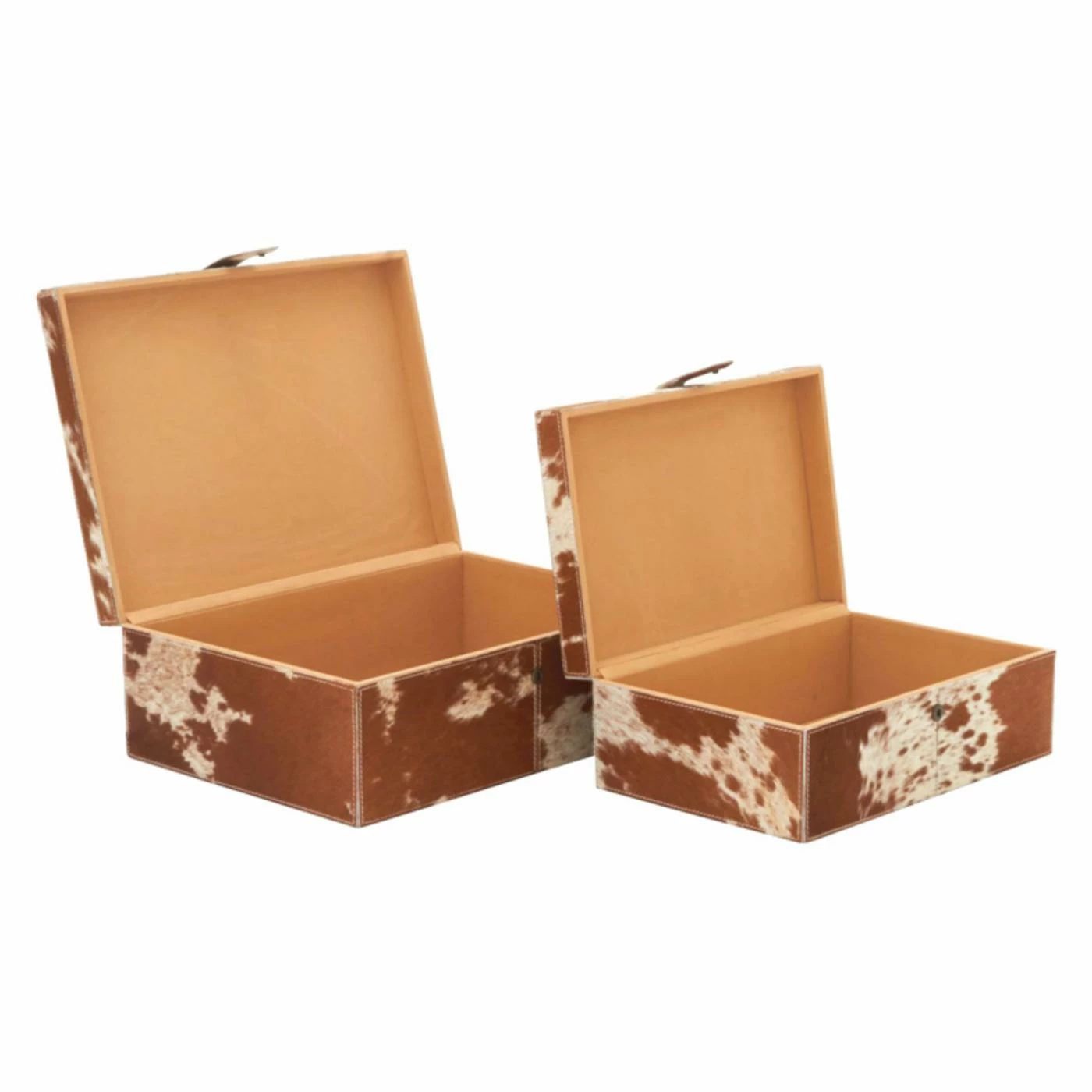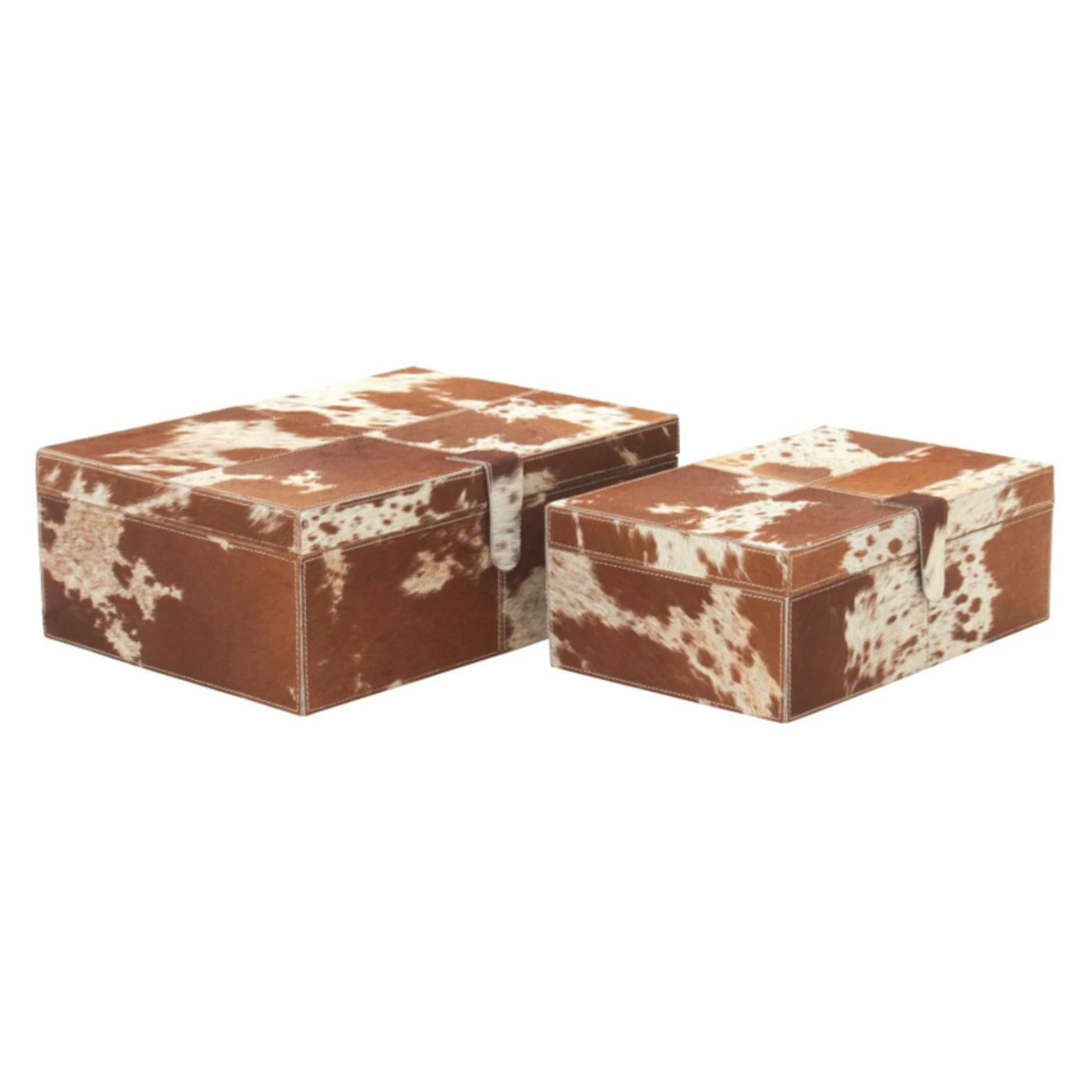 Bring a little of the west to your interior with the DecMode Wood and Leather Hide Decorative Box – Set of 2. Leather hide covers each of the engineered wood boxes, bringing brown and white colors and a luxurious soft texture to interiors. Fold-over flaps fasten the lids shut while making the boxes easy to flip open when you wish to access whatever you tuck away inside.