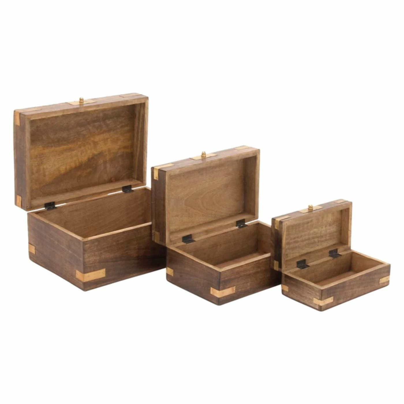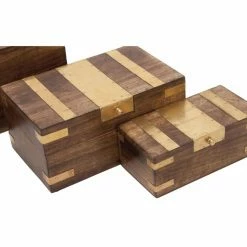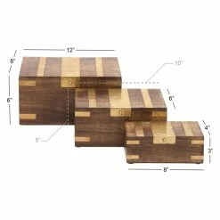 Country modern pine wood construction set the DecMode Wooden Decorative Box with Brass Inlay – Set of 3apart from the rest. Each chest has brass embellishments and accents whose luster stands out from classic brown finish.