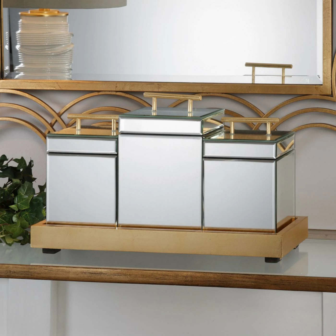 Chic and glamorous, the Uttermost Faustina Boxes And Tray – Set of 4 lend functional storage to a bathroom vanity. Covered in beveled mirrors and beautifully arranged in a gold leaf tray, this trio of lidded boxes are as useful as they are elegant.