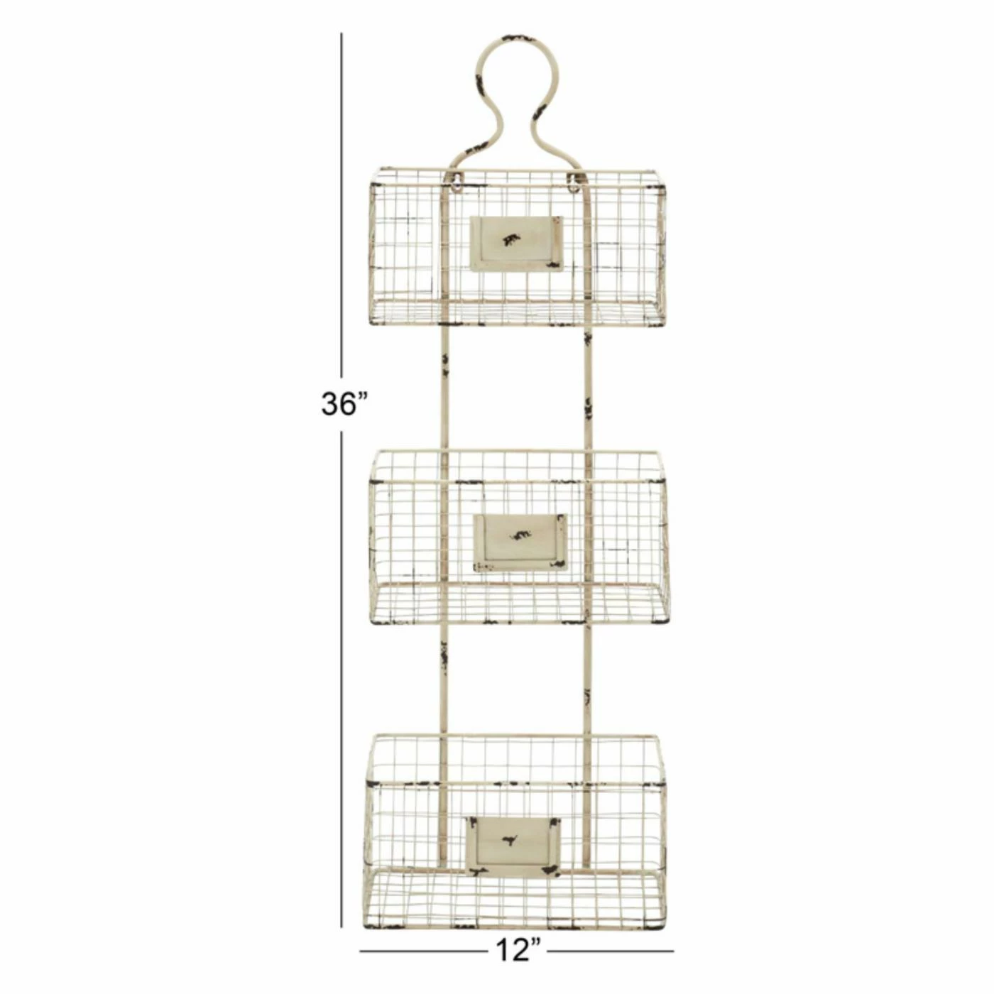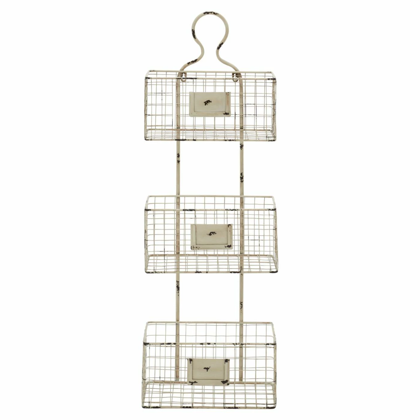 Get organized with the DecMode Hanging 3 Tier Basket Wall Accent! This wall accent makes a sensational place to keep any number of loose items from books to trinkets and more. The piece is crafted from durable iron with three wire baskets incorporated into its design. Each basket comes with a card display on the front. Piece is finished in weathered white.